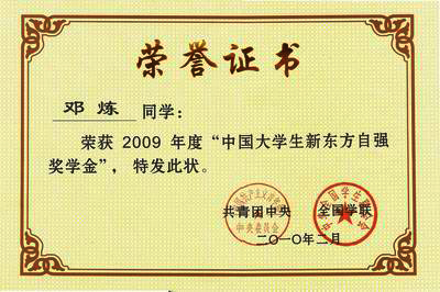 我校邓炼同学获“中国大学生新东方自强奖学金”