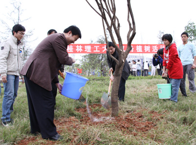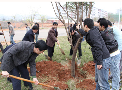 3月12日,正值第32个植树节来临之际,学校党委副书记、纪委书记赵君,党委副书记王赣华,副校长陈学军,党委宣传部、学工部、校团委及机械与控制工程学院、外国语学院领导与老师和学校青年志愿者一起,在雁山校区开展义务植树活动,师生共建绿色生态校园。 植树现场,有的铲土,有的浇水,个个充满激情。经过大家2个多小时的努力,雁山校区田径场的草坪上出现了一棵棵充满生机的绿树。看着用汗水换来的校园新装,师生们脸上无不洋溢着劳动带来的快乐。积极参与此次植树活动,不仅为校园增添了一份新绿,使校园更美,也是为全校师生营造良好的工作、学习和生活环境贡献了自已的一份力量。