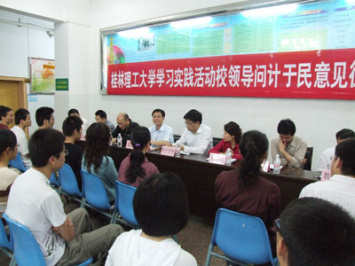 为扎实做好开展深入学习实践科学发展观活动学校领导班子深入调查研究问计于民工作,广泛征求和听取广大师生对学校建设发展的意见和建议,4月24日下午,我校开展了校领导班子“一问二请”问计于民意见征集活动(一问就是学校建设发展问计于师生;二请就是学校建设发展存在的问题请师生查找,学校建设发展的重大问题请师生参与决策)。 本次活动分别在屏风校区图书馆大厅、屏风校区材化系楼一楼大厅、屏风校区教七楼大厅、南校区食堂门口、雁山校区教四楼一楼,屏风校区21栋学生公寓前厅设六个意见征集点,学校党委书记黎志逘,校长赵艳林,党委副书记张学洪,副校长李祥清,副校长肖明贵,党委委员、校长助理华桂林率各职能部门负责人分组到各活动点向广大师生员工面对面征求学校科学发展意见和建议。学校广大师生员工踊跃地参与了这次活动,从教学、科研、人才培养、服务管理、师资队伍建设、校园安全稳定等方面为学校的科学发展积极建言献策。93岁高龄的原学校党委书记柳林同志等许多离退休老干部、老教师也来到图书馆活动点积极参与本次活动。 本次活动中征集到的意见和建议整理后将报学校学习实践活动领导小组办公室,作为学校谋划科学发展的决策依据。作为学校扎实做好开展深入学习实践科学发展观活动学校领导班子深入调查研究问计于民工作的一项重要举措,本次活动充分体现了学校领导班子紧密联系实际、紧密依靠群众领导学校科学发展、办人民满意的理工大学的决心和信心,同时,活动的成功举行也充分体现了学校广大师生员工团结一心、从我做起、推动学校科学发展、努力为办人民满意的理工大学贡献力量的良好风貌。