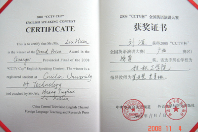 “CCTV杯”全国英语演讲大赛,是由中央电视台英语频道和外语教学与研究出版社联合举办的一项全国性的高水平赛事,已经成功举办了六届。大赛分预赛、复赛、半决赛、决赛和总决赛五个阶段。 2008年“CCTV杯”全国英语演讲大赛广西赛区复赛11月1日在南宁市举行,广西赛区复赛由区教育厅、区大学外语教学研究会和广西医科大学联合承办。区教育厅高教处处长唐春生出席了开幕式并做了热情洋溢的讲话,从初赛中脱颖而出的75名本科组选手参加了本科组的角逐。 复赛分为即兴演讲和回答问题两个环节,各路选手各显才华,我院选手刘洹(勘技07-1班)发挥出色,以优美的语音语调和娴熟的演讲技巧征服了评委和全场观众,以本科组的第二名进入了最后一轮的7人巅峰对决赛(本科组排名前五和专科组前二名的选手),最终获得了特等奖,将与另外两名特等奖获得者代表广西队参加11月中旬在北京举行的半决赛(每个省市选派3名选手),这也是我院参加此项赛事以来第二次进入全国半决赛。另外,我院代表队获得了团体三等奖,其余两名参赛选手分别获得了优胜奖。 此项赛事长期以来得到院领导的高度重视和院团委的大力支持,外语系派出了有丰富指导经验的教师,牺牲数个周末的休息时间对参赛选手进行了系统的培训,参赛的学生也刻苦学习与训练。经过师生的共同努力,最终取得了良好的成绩,为学院争了光。目前,外语系正在积极备战11月中旬在北京进行的全国半决赛。