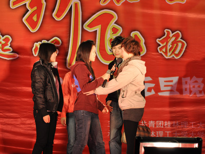 12月31日晚7点30分,在新年的钟声即将敲响之际,我校在雁山校区教三楼前小广场举行了由校团委主办,校大学生艺术团、学生会、社团工委和社团联联合承办的“桂工新展望,梦起心飞扬”2010年元旦文艺晚会。学校党委王赣华副书记出席观看晚会并致辞。 王赣华副书记在致辞中首先为广大师生送去了新年的祝福和问候;他总结了我校09年各项事业取得的成绩,指出广大师生在过去的一年里勤于思考、善于学习、勇于实践、积极探索,为学校的发展增光添彩;他希望广大同学在新的一年里能够更加热爱学校、热爱生活、热爱学习,积极参与各项活动,全面发展自己,不断完善自己,勇于拼搏进取,书写辉煌的青春印记。 晚会分为“青春万岁”、“腾飞梦想”、“跨越未来”三个篇章,通过歌唱、舞蹈、器乐等艺术形式,展现了当代大学生为梦想而奋斗的青春风采。晚会会场氛围浓厚,节目精彩纷呈,充满青春活力的健美操、精彩的双节棍表演、美丽的民族舞蹈和高亢的《西班牙女郎》美声独唱将晚会的气氛推向一个个高潮,热烈的掌声不时从台下传来。在大合唱《超越梦想》中晚会圆满结束。 本场晚会为我校师生带来了一场视觉与听觉的饕餮盛宴,唱响了青春奋进的主旋律,舞出了青春活力的动感节拍,充分展现了我校学子良好的精神风貌,丰富了我校大学生的校园文化生活。