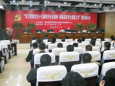 12月22日至23日,“学习贯彻党的十七届四中全会精神 加强高校学生党建工作”理论研讨会在黑龙江哈尔滨举行。本次理论研讨会由教育部高等学校社会科学发展研究中心主办,哈尔滨师范大学承办。旨在深入学习贯彻党的十七届四中全会精神,进一步深入研究新形势下高校学生党建工作前沿性和规律性问题,探索推动高校学生党建工作深入发展的新思路和新举措。 来自全国50多所高校的120余位领导、专家和学者围绕高校学生党建的基本经验及面临的新情况新问题、新形势下高校学生党建工作的新思路新举措、青年马克思主义骨干队伍培养与学生党建工作、高校学生党建工作与和谐校园建设等议题,展开广泛而深入的研讨。 我校党委副书记、纪委书记赵君教授率队参加了此次理论研讨会,并在分组讨论会上发言,介绍我校在高校学生党建工作中的创新做法,得到了与会专家的广泛赞同。