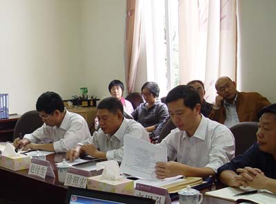 校长张学洪(右二)向检查组汇报反腐倡廉建设工作