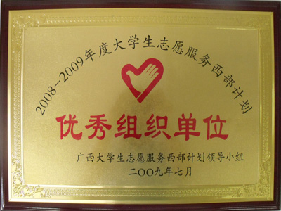日前,从广西大学生志愿服务西部计划领导小组获悉,我校荣获08-09年度广西大学生志愿服务西部计划“优秀组织奖”。至此,我校已连续三年荣获此荣誉。 一直以来,我校积极响应党中央号召,高度重视大学生志愿者服务西部计划志愿活动,把组织大学毕业生参加西部计划作为引导学生服务西部、服务农村,拓宽学生就业渠道的有效途径和重要载体;学校严格按照“强管理、重服务”的整体工作思路,着眼服务大学生就业、服务社会主义新农村建设,扎实做好我校大学生志愿者服务西部计划的选拔招募和跟踪服务;学校还结合自身实际制定出台了相关的激励政策,鼓励学生到西部去、到基层去、到祖国和人民最需要的地方建功立业。 各项工作的开展,构筑了我校服务西部、服务基层的行动导向和就业导向,拓展了服务西部、服务基层的联动效应,取得了良好成效,今年,我校共有86名毕业生报名参加西部计划,经选拔最终录取16名志愿者分赴广西各地县开展志愿服务工作。