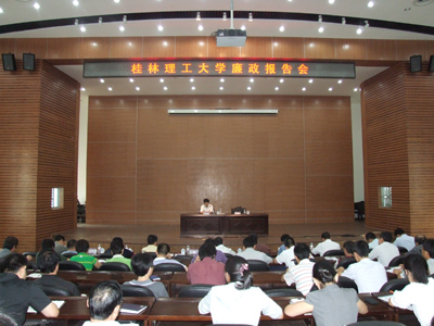 9月21日下午,自治区高校纪工委副书记陆寿万应邀在我校图书馆报告厅作廉政报告。校党委书记赵艳林,校长张学洪,党委副书记、纪委书记赵君,党委副书记王赣华,副校长肖岳峰、阮百尧、陈学军、吴志强等在校的学校领导到场听取了报告。学校副处以上领导干部,机关全体党员及雁山校区建设指挥部全体成员参加了报告会。报告会由赵君副书记主持。 陆寿万副书记的报告以“高校违纪、违法案件的反思与警示”为主题。他通过对一个个违纪、违法案件的分析,深刻剖析了近年来高校违纪、违法案件产生的原因,并从正确处理好做官与做人、权力与责任、理性与欲望、眼前利益与长远利益等方面,对领导干部如何提高拒腐防变能力作了深入透彻的论述。 学校党委副书记、纪委书记赵君代表学校党委、行政感谢陆寿万副书记所作的报告。他希望广大党员领导干部要不断提高自身修养、增强廉洁自律意识,做到“情为民所系、权为民所用、利为民所谋”,努力为学校建设发展作出新的贡献。