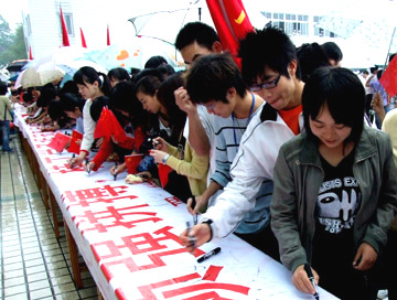 启动仪式结束后,同学们观看了设在体育馆前的奥运知识图片展览,并纷纷在印有“放飞梦想,全球人民共祝中国和谐;顽强拼搏,桂工学子挥洒奥运激情”字样的横幅上签名,表达对奥运的殷切期盼和深深祝福。