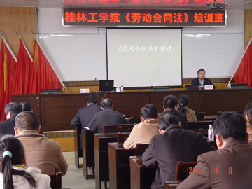 为确保《中华人民共和国劳动合同法》的贯彻落实,保护劳动者的合法权益,提高领导干部和管理人员的法律意识,构建和发展和谐稳定的劳动关系,1月9日下午,学院在党校教室举办了《劳动合同法》学习培训班。对《中华人民共和国劳动合同法》、《中华人民共和国劳动法》进行了学习。培训班由学院院长助理、人事处处长华桂林主持,各单位、各部门分管人事工作负责人、办公室主任、具体经办劳动用工及社会保险的工作人员参加了培训。 学院工会副主席陆平从《劳动合同法》的立法背景、立法过程、具体内容等结合具体事例进行了解读,人事处副处长匡昭平对《劳动合同法》、《劳动法》的相关条款进行了具体说明。 《中华人民共和国劳动合同法》由第十届全国人民代表大会常务委员会第二十次会议于2007年6月29日通过并颁布,2008年1月1日起施行。