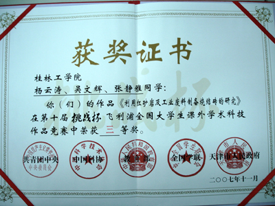 11月19日,第十届“挑战杯”全国大学生课外学术科技作品竞赛在天津市体育馆闭幕。我院参赛的五件作品取得优异成绩,获得一等奖一项,二等奖一项,三等奖三项,总分180分,位列广西参赛高校首位,这是我院学生参加这项赛事10年来取得的新突破和最好成绩。