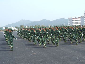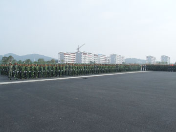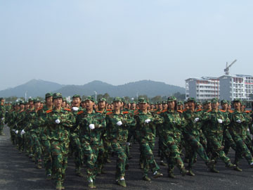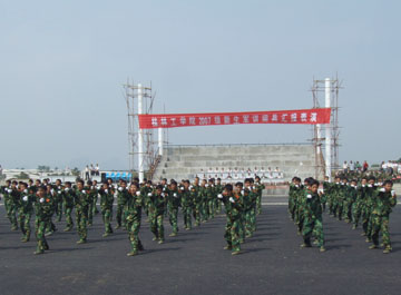 10月4日上午,我院2007级新生军训阅兵汇报表演在雁山新校区体育场隆重举行。 出席新生军训阅兵汇演的有学院党委书记黎志逘,党委副书记、院长赵艳林,党委副书记张学洪,党委副书记、纪委书记赵君,副院长阮百尧,副院长肖明贵,党委委员、人事处处长华桂林,桂林武警支队副队长、2007级新生军训团团长周玉景以及学院各职能部门和教学单位的有关领导。 阅兵汇演由学院武装部部长崔光仁主持。 早上9:30,离汇演还有半个小时,由26个连队3100多名新生和官兵组成的军训团早已在新校区体育场上列好阵势,远远望去是一片撼动人心的橄榄绿。 十点整,随着庄严的国歌响起,2007级新生军训阅兵汇演正式开始了。大会的第一项是阅兵、分列式。在桂林武警支队副队长、军训团团长周玉景的陪同下,学院党委书记黎志逘依次检阅了全场26个昂首挺立的新生军训连队,向教官和同学们致以亲切的问侯。随后,26个新生军训连队在教官的带领下,依次列着整齐的队伍,踏着矫健有力的步伐正步走过主席台,同学们一致向主席台上的领导行注目礼,高喊着“严格训练,严格要求,努力学习,报效祖国”,嘹亮的口号声带着桂工学子燃烧的激情响彻雁山上空。 紧接是军训汇报表演。首先出场的是由100多名女生组成的女子方块队。在教官洪亮的口令声中,她们齐声高唱军歌《一二三四》,表演了英姿飒爽的队列操。队列分错、交叉,那嘹亮清脆的歌声伴随着她们整齐而稳健的步伐,生动而传神地演绎出当代女兵的巾帼风貌! 女子方块队刚刚退场,男子擒敌连便刚健勇武地冲上来,俨然一群杀气腾腾的战场英雄。随着一声令下,一百多名高个男生迅速地摆出一个分散的矩形方阵,遵照教官的口令,高喊着口号,迅猛有力、豪气万丈地打出一套虎虎生威的擒敌拳。全场观众报以热烈的掌声。 最后的压轴大戏是军训教官们的精彩表演。多位训练有素的教官手把棍棒,表演了一套武警中常用的“应急棍术”,棒起棒落,时旋时伸,英气逼人。紧接着是二人对战,每一招式都扣人心弦。体育场上时时掌声雷动,不绝于耳。 在精彩的汇演过后,武装部部长崔光仁宣读了关于表彰2007级学生军训先进集体和先进个人的决定,并为各先进集体和先进个人代表颁发了奖状、证书。 桂林武警支队副队长、2007级新生军训团团长周玉景与学院党委副书记、院长赵艳林先后发表了讲话。在讲话中,两位领导都对教官与同学们多日来的艰苦训练所取得的成绩表示了充分的肯定,高度赞扬了他们不畏艰苦、刻苦训练、团结互助的革命乐观主义精神,并鼓励同学们将军训过程中培养出来的好思想、好作风发扬到今后的学习生活中,积极弘扬“艰苦创业、敬业奉献、团结互助、开拓进取”的桂工精神。 伴随着铿锵有力的《军歌》的响起,为期十天的新生军训圆满结束。