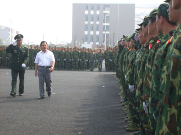 学院党委书记黎志逘在桂林武警支队副队长、军训团团长周玉景的陪同下阅兵