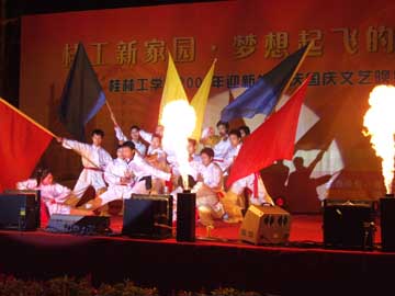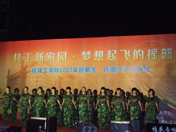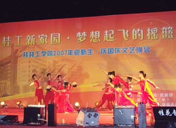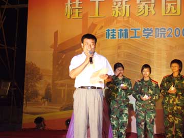 9月30日晚上,我院2007年“迎新生,庆国庆”文艺晚会在雁山校区大操场唱响。学院党委副书记、纪委书记赵君,党委委员、人事处处长华桂林,党委宣传部部长于海平,学工部部长熊英,团委书记辛立章等以及部分系(院)的领导,新生年级辅导员、班主任与2007级新生一起观看了精彩的演出。 晚会中,有优美抒情的独唱、激情彭湃的诗朗诵、青春奔放的舞蹈,还有充满阳刚之气的武术表演,让2007级新生享受了一次充满青春朝气的文化盛宴。在现场为2007级七位新生过生日,更把晚会推向了高潮,赵君副书记代表学院给过生日的同学送上真挚的祝福,引得全场掌声雷动,让2007级全体新生都感受了桂工大家庭的温暖。 新校区,新学子,充满着青春与活力,充满着对未来的美好憧憬,在这个喜庆的日子里,让我们共同祝愿我们的祖国更加繁荣、昌盛,我们的学校明天更加美好。