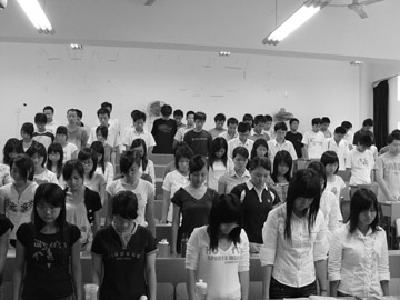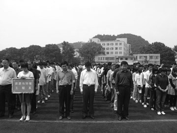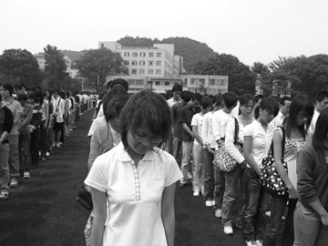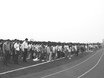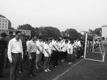 国旗低垂,汽笛长鸣,山河齐哀,举国同悲。5月19日下午14时28分,我院全体师生员工与全国人民一起举行向四川汶川大地震遇难同胞志哀仪式,为四川汶川大地震遇难同胞默哀3分钟。在学院屏风校区,集中在运动场上的数千名师生员工和在教室里上课的师生们低首肃立,沉浸在对四川汶川大地震遇难同胞深深的哀思之中。此时,防空警报声也回旋在上空,全场气氛一片庄严肃穆。同一时间,学院雁山校区和南宁校区的师生员工也举行了志哀仪式。5月19日至21日,学院停止所有公共娱乐活动,以表达对在地震中死难同胞的深切哀悼。