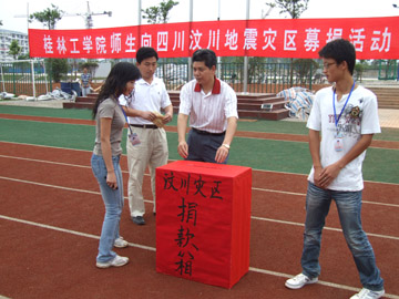 四川汶川县发生大地震以来,受灾地区人民的状况时时牵动着学院全体师生员工的心。继5月14日下午屏风校区师生员工举行“为国分忧,为灾区人民奉献爱心”的大型募捐活动之后,5月15日早7点,雁山校区师生员工紧接着又举行了为汶川灾区人民募捐的活动。学院党委副书记、纪委书记赵君在募捐活动仪式上发表讲话,学院党(院)办主任莫坷主持募捐活动仪式。 赵君副书记代表学院党委和行政号召雁山校区全体师生员工,拿出自己的热情、奉献自己的爱心、展示桂工人的良好品质,为灾区人民尽力,与灾区人民风雨同舟,踊跃向灾区群众捐款捐物,用实际行动帮助灾区人民战胜困难,度过难关,重建家园。 赵君副书记、莫坷主任以及在雁山校区值班的各教学单位、职能部门领导和工作人员率先捐款,雁山校区全体学生也都排成长队纷纷捐款,在校保安也加入了捐款队伍,每个人都发扬了“一方有难,八方支援”的精神,以自己的实际行动积极向灾区人民伸出援助之手,把自己的一片真情和爱心献给了灾区人民。 在短短的不到半个小时的时间里,雁山校区师生员工就募捐了42000多元,这笔捐款将与屏风校区募捐的22万多元捐款一起通过有关部门第一时间送往灾区。