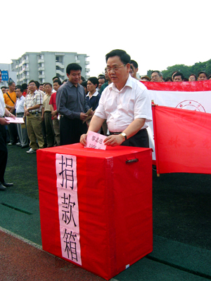 震灾无情,民心有爱。5月12日下午14时28分,四川省汶川地区遭受8.0级严重地震灾害,造成巨大的人员伤亡和财产损失。一方有难,八方支援。面对灾情,学院党委立即召开会议,布置了支援抗震救灾工作,5月14日下午5:00在学院运动场举行了向四川汶川地震灾区募捐仪式。仪式由学院副院长李祥清主持,学院党委书记黎志逘在募捐仪式上号召大家“拿出自己的热情,奉献自己的爱心,展示桂工人的良好品质,为国分忧,为灾区人民尽力,与灾区人民风雨同舟,踊跃向灾区群众捐款捐物,用我们的实际行动帮助灾区人民战胜困难,渡过难关,重建家园” 。 在校的党委书记黎志逘,党委副书记、纪委书记赵君,副院长李祥清、阮百尧、肖明贵,院长助理华桂林亲自带头捐款,学院院长赵艳林、党委副书记张学洪出差在外,也委托学院代为捐款,全院师生员工近万人积极主动来到捐款现场慷慨解囊,以捐款的方式表示了对四川抗震救灾的支援,也表明了与灾区人民共度难关的心意。截止到发稿之时,学院已募捐到救灾款20多万元。 参加捐赠的很多教职员工都说,灾区受灾情况太惨重,学院举办此次活动非常及时;资环系吴虹教授激动地说:“抗震救灾,匹夫有责。这是我们的兄弟姐妹们在受难,我们义不容辞地要帮助他们。我们要把灾难转化成全国人民团结一心、众志成城的精神和力量” ;一位不留姓名的老师个人捐款达1万元;电计系男子足球队的队员们把经过艰苦拼搏获得的学院足球比赛冠军奖金400元全部捐献出来,他们告诉记者,虽然这点捐款杯水车薪,但可以表达对灾民的一点心意,也为能为灾区出份力而感到高兴;艺术系学生徐丽丽表示,自己虽然捐款不多,可相信大家的合力一定能为帮助灾区渡过难关出一份力;还有的退休老教师特地从家里赶来捐款,他们说,从电视上看到地震的场景很是揪心,很想为灾区人民做点什么,听到学院组织捐款的消息就赶来了;刚放学的孩子也跟着家长为灾区捐款。这一切真可谓是“抗震救灾、众志成城、心系灾区、奉献爱心”。 学院领导表示,明天雁山校区的捐款结束后,将会以最快的速度把募捐款送达灾区,为抗震救灾工作发挥作用。