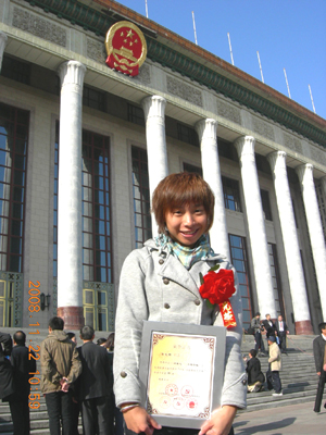 官红艳手捧荣誉证书在人民大会堂前留影