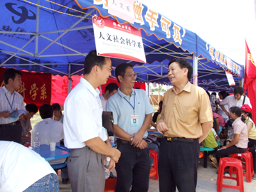 9月23日是我院2007级新生正式报到注册的第一天。8点多钟的时候,设在雁山校区学生食堂前的整个迎新接待站就已经是摩肩接踵、人声鼎沸,热闹了起来。然而热闹之中的迎新工作却是一派井然有序、和乐融融。学院党委书记黎志逘,学院院长赵艳林,学院党委副书记、纪委书记赵君,学院副院长李祥清、肖明贵早早地来到迎新现场视察指导迎新工作。新华社桂林支社、中国改革报驻桂林记者站、桂林日报、桂林电视台等各大媒体记者今天也赶到了雁山校区迎新现场进行采访,并参观雁山校区。 当各系院的迎新工作学生志愿者们高高举着系、院牌等候在那里接站并主动帮新生及其家长拿包抗行李,并带他们或去系院接待站报到、或带到休息处休息的时候,当披着印有金黄色的“学生党员为您服务”字样红绶带的学生党员忙着从汽车行李箱帮助新生取行李的时候,当接待站的老师和同学们热情地请新生和他们的家长坐下,并递上一杯清水问候“一路辛苦”的时候,当报到注册处、收费处、军训物品发放处、学生食堂售饭口的师生员工们面带微笑,耐心地解答新生和家长们的每一个问题、认真做好每一项工作的时候,当志愿者服务队的同学们耐心地为学弟、学妹们讲解学校、系院和专业情况,为新生家长的咨询住宿、返程耐心地解疑答难的时候,当老师和志愿者们帮助新生拿着大包小包到宿舍入住时,旅途劳顿、困乏疲惫的新生和家长们的脸上无不流露出了满意的笑容。 在学院提出了尽量做到让学生满意,家长满意,社会认同的迎新工作目标后,学院各级领导身体力行,带领老师们做好迎新工作。学院领导,各系、院党政主要负责人和各有关职能部门负责人都在迎新一线指挥工作。22日晚上,赵君副书记、肖明贵副院长带着指挥部的同志们,在学生入住后一个一个宿舍看望学生。李副院长从学生食堂的一楼到三楼,从吃饭的学生到做饭的炊事员认真调查了解饮食情况。在迎新工作中,有很多老师亲自帮学生拎着行李送到宿舍去,还有300多名学生迎新志愿者在迎新一线尽情地挥洒着汗水。在师生们热情的服务的感染和带动下,有的刚刚报到的新生也志愿加入到了迎新服务志愿者的行列。 学校还为贫困生开辟了“绿色通道”,可以先报到,然后办理银行贷款或缓交学费手续。而且,雁山校区的食堂也不对外承包,不以赢利为目的,坚持以服务学生为宗旨,在雁山镇肉价、菜价高于市内的情况下,坚持做到“服务不减,标准不降,价格不涨”,与屏风校区饭菜价格完全相同。 在迎新现场,记者见到了保卫处处长崔光仁同志,由于差不多整整两天他都顶着烈日指挥工作,他的脸已经被太阳晒得黝黑。据崔处长介绍,学院保卫处8名同志和学院雁山校区37名保安人员昼夜值班,雁山镇派出所和雁山交警大队各派出4名同志,协助做好雁山校区新生入学的安全保卫工作。从昨天上午8点到今天下午4点半,学院保卫处的领导和雁山校区的安全保卫人员的28名年轻人没有休息过一个小时,他们每隔一个小时就要对每一栋楼房进行一次检查。截至目前,迎新工作秩序井然,没有出现一起争执事件,从迎新工作开始到采访时,已经有2800多车次进入雁山校园,也没有出现一次交通事故或者交通堵塞的情况。 据统计,截至23日晚7点钟,已经有2500多名本科新生顺利报到入学。