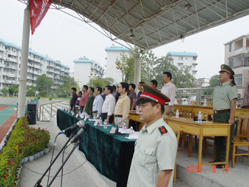 9月15日下午4点,伴随着微微的秋风,校田径场上迎来了一批朝气蓬勃,英姿飒爽的桂工新人。06级新生军训开训典礼在这里隆重举行。校领导赵艳林、李祥清、周德俭、肖明贵以及武警桂林市支队副支队长吴登培中校以及有关院、系、部、处的领导出席了本次大会并在主席台就坐。本次大会由学院武装部部长崔光仁主持。 首先进行的是军训团各级领导的任命。由学院军训领导小组组长李祥清副院长宣读军训团领导任命书,任命武警桂林市支队副支队长吴登培中校为军训团团长,桂林工学院武装部部长崔光仁为军训团政委,武警桂林市支队大队长邱诗荣为军训团参谋长。今年的军训团队阵营强大,由来自学院本部和学院博文管理学院的本专科新生3512名组成,本届军训团共有4个营33个连。 在开训典礼上,军训领导小组组长李祥清副院长作了军训动员报告。他指出,我院作为全国大学生军训试点单位之一,今年已经是第19期了。他要求每一位参训学员都要具备坚强的毅力,吃苦的精神,克服困难,战胜自我,同时要严守纪律、注意安全,争取在9月27日的军训汇报阅兵中,以优异的成绩接受各级领导的检阅。随后,军训团团长、武警桂林市支队副支队长吴登培中校和军训团新生代表崔彦彦先后作了发言。 赵艳林院长在讲话中希望本次军训一要做到严格要求,严格训练;二要达到磨练意志,提高思想,增强纪律,强壮身体的目的。 最后,典礼在雄壮的军歌声中结束。