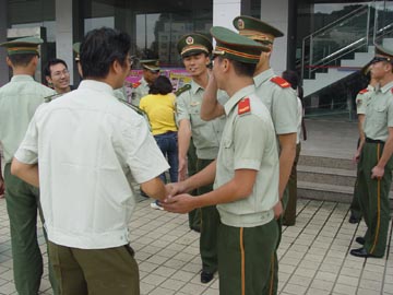 2006年9月14日下午,桂林工学院2006级军训承训部队武警桂林市支队官兵进驻我院。 5点,军训团各连连长和指导员在体育馆门口参加见面会。学院军训领导小组组长李祥清副院长对官兵的到来表示欢迎。军训团团长吴登培中校在见面会上作了简要讲话。各连连长、副连长和指导员进行了亲切交谈,分别就各连训练场地和学员等问题交换了意见。