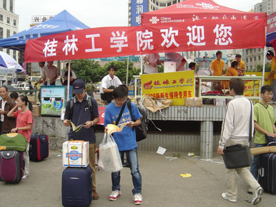 为了使桂林工学院的新生有“宾至如归”的感觉,桂林工学院学生工作部(处)特地组织勤工助学的学生们组成迎新外接组,于9月11日6:00到9月12日晚上12:00,在桂林火车站和桂林汽车站设点迎新。为了保证外接工作的顺利进行,学生工作部(处)思想教育科白永生科长、学生工作部(处)郝文佳和院团委张瑞在9月10日下午专门组织外接同学在学工处会议室召开会议,对外接工作期间的值班、注意事项等进行了细致而仔细的安排,尤其是强调每一位外接的同学要以最热情的态度迎接每一位新生和家长的到来。另外还积极与学院后勤集团联系安排外接车辆,学院共派出6辆大巴进行火车站到学院的来回接送。