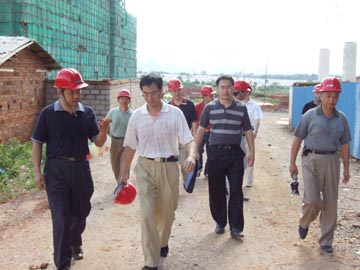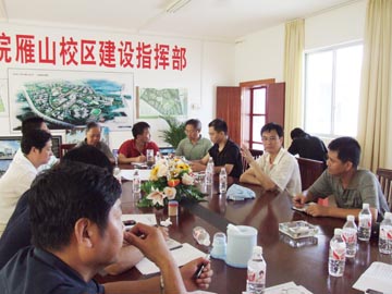 6月29日下午,学院院长赵艳林、副院长周德俭、副院长阮百尧一行到雁山校区检查指导工作,党办(院办)主任耿俊茂随同前往。 在学院党委副书记赵君、副院长肖明贵以及雁山校区建设指挥部人员的陪同下,冒着炎炎烈日,赵院长一行深入施工现场进行检查,了解雁山校区工程进展及工程质量情况。 检查结束后,在雁山校区建设指挥部办公室召开了座谈会。赵君副书记等人就雁山校区学生宿舍、道路施工、弱电工程、校园环境、新生及家长接待等方面存在的主要问题作了汇报。听完汇报后,赵院长对雁山校区的全体建设者们表示了亲切的慰问,他说,在大家的共同努力下,雁山校区建设的进度明显加快了,大家付出了很多,我代表学院衷心感谢大家。同时强调,一要继续努力,保持目前这种热情和干劲,打好最后攻坚战;二要精心组织,协调做好各配套工程;三要抓好质量,保证安全;四要积极跟政府部门和施工单位搞好协调工作;五要做好后勤保障工作,学院会在人力、物力、财力上给予大力支持。