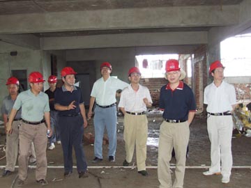 院领导(右起:周德俭、阮百尧、赵艳林、肖明贵、赵君)检查教学楼施工情况