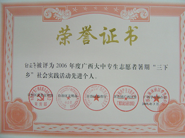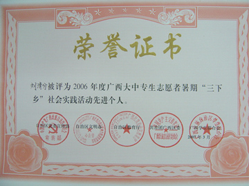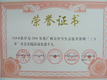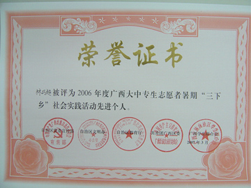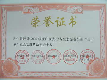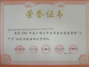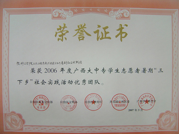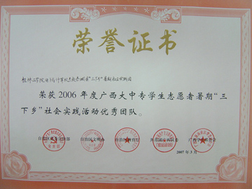 近日,由自治区党委宣传部、自治区文明办、自治区教育厅、共青团广西区委及广西区学生联合会等6家单位共同评选的2006年度全区大学生暑期“三下乡”社会实践先进集体和个人揭晓。我院荣获“2006年广西大学生志愿者暑期‘三下乡’社会实践先进单位”称号。