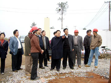 2006年2月14日,正当农历腊月二十七,家家户户都洒扫居室、购买年货,准备迎接并欢度中华民族最隆重的传统节日——春节。学院党委书记黎志逘、院长赵艳林于上午10时来到雁山校区施工现场,视察新校区建设的施工进度并带来水果等慰问品对现场施工人员表示节日的慰问。 雁山校区建设指挥部指挥长肖明贵副院长,副指挥长陈慕杰,工程部主任刘宜河以及新校区建设指挥部的工作人员陪同书记、院长视察了已完成土方、桩基浇注和回填等全部基础工程的1#学生食堂、4#系部教学楼、5#公共教学楼工地,和已完成部分地基土方工程的1-7#学生公寓楼工地等近10万平方米建筑面积的首批施工工程。黎志逘书记一再强调说,百年大计,质量第一,一定要保证质量。中央提出要又好又快,我们的新校区工程也要做到又好又快。黎书记对施工方负责人说,学校是为人民办学的机构,不是盈利机构,我们会尽到我方的责任,确保资金到位,保证正常施工的进行;你们也要确保质量和工期,同时要重视对所有施工人员的安全教育,春节后要让所有工地的安全标识、安全措施到位,节日期间要做好工地内外的安全保卫工作。各工地施工方负责人也纷纷表示,请学院领导放心,他们一定按照合同要求保质保量完成施工任务,同时希望工程监理人员严格监督,及时提出宝贵意见,并表示要争取在合同要求的8月30日完工并交付使用。赵艳林院长立即指出,不是争取,而是确保。现在整个广西都知道我们的新校区今年9月就要正式入住,工学院和其他院校还不一样,我们都是懂行的,有不少土建专家,我们的工程一定要做好,希望施工单位将工学院新校区工程做成品牌。