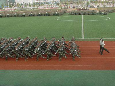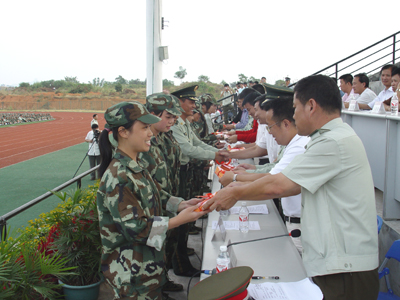 10月14日下午,我院2008级新生军训总结表彰大会在雁山校区体育场隆重举行。 迎着金秋灿烂的阳光,27个连队3300多名新生站着笔直的军姿,在体育场上荣光焕发、精神抖擞地等待着汇报自己刻苦军训的成果。学院党委副书记张学洪,党委副书记、纪委书记赵君,副院长李祥清,副院长肖明贵,桂林市武警支队书记张勋玮,武警支队副队长、2008级军训团团长周玉璟,学院党委委员、院长助理华桂林,党(院)办主任莫坷、学工部部长熊英以及各系院有关领导出席军训总结表彰大会并在主席台就座,学院武装部部长崔光仁主持大会。 16:00,在庄严雄壮的《国歌》乐曲声中,2008级新生军训阅兵汇报表演正式开始。赵君副书记在军训团首长的陪同下检阅了全场的27个连队,并向教官和2008级新生们致以亲切的问候。 检阅完毕后,分列式开始。27个连队在教官的带领下,高喊着“严格训练,严格要求,努力学习,报效祖国”的口号,踏着正步一一走过主席台,接受领导的检阅。接着,由300名新生组成的擒敌连喊着“严格训练,严格要求”的响亮口号进场。随着教官的一声令下,一整套擒敌拳伴随着有力的口号完美地打出,他们动作整齐,身姿矫健,整个场面气势恢宏,精彩的表演博得在场观众一片喝彩。擒敌连刚下,女子列操连便唱着《一二三四》军歌进场了。200多人的连队,在教官的指令下,唱着清脆而嘹亮的军歌踏着整齐有力的步伐,不断变幻出各种优美的队形,她们精彩的表演让人赏心悦目。 张学洪副书记宣读了《关于表彰2008级学生军训先进集体和个人》的决定,在主席台前排就座的领导为各先进集体和个人颁发了奖状及证书。 周玉璟队长和李祥清副院长发表了讲话,对2008级新生和全体教官在军训中所取得的成绩给予充分肯定。李祥清副院长代表学院向出色完成军训工作的部队首长和教官致以崇高的敬意和衷心的感谢,高度赞扬了新生不怕苦、不怕累的训练精神,并希望新同学们继续发扬这种精神,以良好的精神面貌投身到大学学习生活中去,刻苦学习,团结奋进,报效祖国。 在嘹亮的《军歌》声中,2008级新生军训总结表彰大会圆满结束。