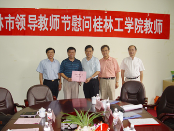 在第24个教师节来临之际,9月8日上午,桂林市政协主席李文杰带领桂林市教师节慰问组三组来到我院,向全院广大教师表示节日的问候,并送来了慰问金。我院党委副书记、纪委书记、工会主席赵君,副院长李祥清,党委委员、院长助理、人事处处长华桂林,院长助理、土木工程系主任陈学军等领导接待了慰问组。市慰问组领导参观了校园,并与院领导和部分教师代表进行了座谈。 赵君副书记代表学院党委、行政对桂林市领导的到来表示热烈的欢迎,并代表全院教职工对桂林市市委、市人大、市政府、市政协对我院和我院广大教师的关心与支持表示衷心感谢。赵君副书记向李文杰主席一行介绍了学院的基本情况和办学特色,以及学院在校园建设、专业建设、教师队伍建设等方面的发展情况,尤其是近几年来在教学科研、为地方经济服务等方面取得的突出成果。他表示,学院将进一步加快改革发展步伐,狠抓教学质量,更加切合地方经济建设和社会发展需要来培养人才、进行科学研究和开展社会服务,为促进国家特别是广西和桂林市的经济建设和社会发展做出新的更大的贡献;同时也希望桂林市四家班子能一如既往地关心和支持我们学院的建设发展。 李文杰主席代表桂林市四家班子向教师们表示崇高的敬意,并致以节日的祝贺和问候。他在讲话中肯定了我院专业性强,培养了大批社会需要的人才,被社会认可。对我院建校52年来取得的成就表示敬佩,对广大教师通过坚持不懈的努力所取得的成绩表示祝贺,对桂林工学院为桂林市的建设和发展做出的贡献表示感谢。李文杰主席对我院的发展充满了信心,并表达了良好的祝愿。 博士生导师、旅游学专家程道品教授在座谈会上代表学院教师对桂林市领导的关怀和问候表示感谢,并且表示要加倍努力,回报社会的关爱;要发挥专业优势,积极、主动地参与到桂林市的建设中,为桂林市的建设献计献策、添砖加瓦。