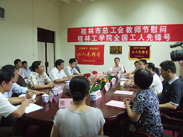 值第二十四个教师节来临之际,桂林市总工会党组书记、副主席张耀中等市总工会领导及市教育工会领导来我院慰问全国工人先锋号,开展“鲜花送劳模 喜迎教师节”活动,并与我院支援四川灾区抗震减灾技术专家组专家进行座谈。学院党委副书记、纪委书记、工会主席赵君出席会议,工会副主席陆平,学院支援四川灾区抗震减灾技术专家组专家等参加会议。在座谈会上,桂林市总工会党组书记、副主席张耀中代表桂林市总工会向我院“全国工人先锋号”专家送上慰问金和象征着美好祝福的鲜花。 张耀中副主席在座谈会上对我院支援四川灾区抗震减灾技术专家组表达了崇高的敬意,并向在教育事业上呕心沥血、尽职尽责工作的我院广大教师表达了节日的问候。张耀中副主席说,专家组发扬“一方有难,八方支援”的精神,不怕艰苦,每天工作15个小时,顶着风雨、冒着余震的威胁,对郫县9个乡镇和县城的公用建筑、民用建筑进行了技术评估和勘测,同时还充当了灾情和科普知识的讲解员,为灾区抗灾减灾工作做出了突出贡献,专家组是教师群体中的杰出代表。 我院支援四川灾区抗震减灾技术专家组成员王磊博士在会上作了发言,介绍了在四川灾区抗震救灾的具体情况。 赵君副书记说,长期以来,市总工会对我校的工会工作高度重视,十分关心,特别是在这次汶川大地震我们派出抗震救灾专家组的工作中,得到了市总工会的大力支持。赵君副书记代表学院党委和行政对市总工会的亲切关怀表示衷心感谢,并希望市总工会今后一如既往地关心支持我院的各项工作。