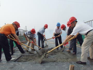 经过两个月的日夜艰苦奋战,6月3日,继雁山校区一期工程项目1#学生食堂和5#教学楼主体结构5月份封顶之后,4#教学楼主体结构又如期封顶。下午5时,封顶仪式在4#教学楼楼顶举行。学院副院长、雁山校区建设指挥部指挥长肖明贵,桂林地建有限责任公司董事长李小平,桂林地建有限责任公司副总经理赵干芸,学院土木系主任、雁山校区建设指挥部副指挥长陈学军,学院基建处处长、雁山校区建设指挥部副指挥长陈慕杰,学院南方监理公司总经理蒋云建,雁山校区总监理奉远祁,学院基建处副处长刘宜河等领导豪迈地挥锹为4#教学楼顶盖上了最后的一方水泥,胜利地结束了新校区建设的第一次攻坚战,为新校区建设的开篇划上了一个圆满的句号,也为整个雁山校区建设的顺利进行奠定了一个良好的开端。喜庆的鞭炮震耳欲聋,欢乐的礼花响彻云霄,向四方传递着桂工胜利的喜悦。这是新校区建设史上一个激动人心、令人难忘的的时刻,这一刻,凝聚着多少人的心血和汗水,凝聚着多少人的热望和期待,“桂工精神”在这里再一次得到了有力的诠释。“良好的开端是成功的一半”,据雁山校区建设指挥部有关负责人介绍,下一个阶段的建设任务会更加艰巨,我们深信,在学院党委的坚强领导下,在雁山校区建设一线同志们的奋力拼搏下,在全院师生员工的大力支持和配合下,新校区建设的各项任务一定能够圆满完成。 学院党委宣传部、统战部副部长钟克庆,桂林地建有限责任公司、南方监理公司的有关同志和桂林日报等媒体记者参加了封顶仪式。