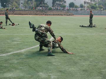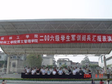 秋高气爽,桂花飘香,屏风山下,绿茵场上,桂林工学院、桂林工学院博文管理学院2006级学生军训阅兵汇报表演于9月27日上午在学院运动场隆重举行。 出席军训阅兵汇报表演的来宾有:桂林空军学院政治部主任黄增庆,广州军区综合训练基地训练部政委付忆民,武警桂林市支队副支队长吴登培,桂林市七星区武装部副部长李香伟,桂林电子科技大学副书记梁丁丁,桂林医学院副院长罗放,桂林师范高等专科学校党委办公室主任伍国祥,桂林旅游高等专科学校学工处处长刘克生,桂林航天工业高等专科学校学工处副处长肖阳。学院领导有:党委书记黎志逘,院长赵艳林,副院长周德俭、阮百尧。军训阅兵汇报表演由我院武装部部长崔光仁同志主持。 奏完庄严的国歌后,阅兵、分列式正式开始。学院党委书记黎志逘在武警桂林市支队副支队长、军训团团长吴登培的陪同下,进行了阅兵。由3522名新生组成的28个男女方队参加了本次军训汇演。身穿统一迷彩服的他们,动作整齐,英姿飒爽,口号响亮,目光坚定,士气饱满,挥动的臂膀有力坚定,踏出的步伐整齐稳健,朝气蓬勃地走过主席台向首长致敬。 参加汇报表演的有女子擒敌拳、男子擒敌拳、女子队列操、班组反劫持战斗行动以及军训教官擒敌团体操。他们个个精神抖擞,英勇果断。勇猛有力的横踢、侧踢、勾拳、连击、别臂、弹踢,看起来真是行如猛虎,站如泰山。他们的精彩表演得到了首长和领导们的肯定,赢得了在场同学的热烈掌声。教官的表演更是精彩,他们动作娴熟、基本功扎实,操练虎虎生威,展示了武警部队威武之师、文明之师的良好形象。 随后举行了2006级学生军训先进集体和先进个人颁奖仪式。 武警桂林市支队吴登培中校发表了讲话。他首先对这次军训取得的成绩予以了充分的肯定,希望同学们把这次军训中好的传统、好的作风运用到今后的学习、工作、生活中去,努力培养服从命令、严守纪律、雷厉风行、勇敢顽强的作风。刻苦学习,圆满完成学业,在大学这个熔炉中百炼成钢,早日成为国家建设的栋梁之材。 学院副院长周德俭在讲话中希望同学们在以后的学习和生活中,将军训中培养的好思想好作风,团结友爱、自强不息、奋发向上、顽强拼搏、严守纪律的精神风貌,带到今后的学习和生活中去。希望大家做到与时俱进,弘扬桂工精神,做一个理想远大、热爱祖国的人,追求真理、勇于创新的人,德才兼备、全面发展的人,为推进学院的全面建设和发展,为祖国更辉煌的明天而奋发图强。 最后,本次军训阅兵汇演在雄壮的军歌中圆满结束。