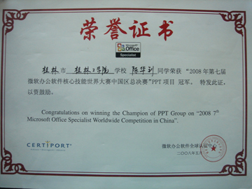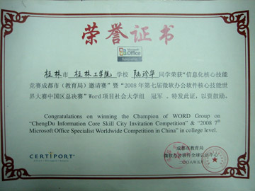 我院在此次大赛中表现突出,取得了Excel项目大学组冠军院校、PPT项目冠军院校2个集体奖项和5个个人奖项。为了提高我院家庭经济困难学生的就业竞争力,我院勤工助学公司一直与桂林市微软认证中心联合开展微软核心办公软件培训,并从PHE项目中拿出资金资助部分家庭经济困难学生参与培训,我院博文管理学院和管理学院的陆珍华、陈华钊、罗海军三名同学就是因在培训中成绩优异而被桂林市微软认证中心选送参加本项竞赛的中国区总决赛,并在比赛中分别获得“Word项目大学组冠军”、“PPT项目冠军”、“Word项目大学组亚军”。