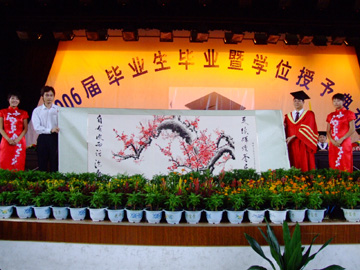 6月26日上午,学院2006届毕业生毕业暨学位授予典礼在体育馆三楼隆重举行。学院学位委员会成员、学生工作干部以及院本部全体毕业生2000余人参加了典礼。在主席台就座的院学位委员会成员有:学院党委书记阳国亮,院长赵艳林,党委副书记唐善茂、张学洪,副院长周德俭、阮百尧、肖明贵,研究生处处长刘康怀,科技产业处处长邹正光,资环系主任解庆林,土木系主任陈学军,电计系主任牛秦州,管理学院院长周永生,旅游学院院长程道品,艺术系主任常新航,人文社科系党总支书记梁军,成人教育学院院长吴郭泉,应用技术学院院长陈先华。 大会由张学洪副书记主持,阳国亮书记发表了热情洋溢的讲话。他首先代表学院党委和行政向我院2006届3000多名毕业生表示衷心的祝贺,同时向为他们的成长付出辛勤汗水的教职工表示崇高的敬意。在回顾了毕业生们在校学习期间所取得的成绩以及为母校建设和发展所做出的积极贡献后,他向毕业生们提出了三点要求:一要扎根基层,勤奋工作,报效祖国,服务社会;二要团结协作,诚实守信,抓住机遇,奋发进取;三要勤奋学习,知行合一,大胆实践,开拓创新。他说,走过50年风雨历程的桂工正在为创建高水平的教学型大学而努力奋斗,学院 “两申”目标的实现固然要靠在校师生员工的艰苦奋斗,同时也离不开社会各界特别是校友们的关心、支持和帮助,希望毕业生们以后要一如既往地关注母校的发展,多为母校出谋划策,多为母校与社会的联系牵线搭桥,在前进的道路上,相互支持、共同发展。最后,阳书记代表学院全体师生员工衷心祝愿毕业生们在新的征途上,事业有成、宏图大展、前程似锦! 阳书记讲话后,教师代表程小辉、在校生代表王卡、毕业生代表谷丽敏先后发言。 在唐善茂副书记宣读自治区和学院关于表彰2006年度优秀大学毕业生的决定,周德俭副院长宣读我院广西自治区选调生、志愿服务西部计划和西藏就业毕业生名单后,学院领导为他们颁了奖。 大会的最后一项议程:学位授予仪式,在阮百尧副院长宣读2006届毕业生毕业资格和学位资格审查报告后举行。我院2006届已完成全部学业获得毕业资格的毕业生有3183人,其中硕士研究生92名,本科生1923名,高职高专生1168名。他们当中有92人获得硕士学位,1877人获得学士学位;有8名被上海同济大学等录取为博士研究生,有146名被武汉大、同济大学、浙江大学等院校或研究单位录取为硕士研究生,有62名高职高专生获得专升本资格。 毕业典礼后,学院领导与毕业研究生以及优秀毕业生们合影留念。