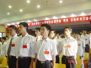 6月25日,我院第八次共青团员代表大会在南校区礼堂隆重举行。大会由学院团委副书记陶剑飞主持,300多名团员代表参加。学院党委副书记张学洪,共青团桂林市委书记刘迎春、学院党委组织部部长赵君、学院第七届团委书记江云清、湖南科技学院团委书记张建利、桂林各兄弟院校团委书记以及各系(院)分团委书记等出席了开幕式并在主席台就座。出席大会开幕式的还有学院各有关职能部门以及各系院党总支(直属支部)的有关领导。