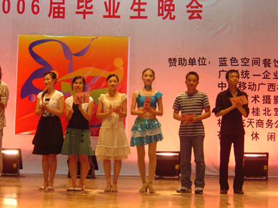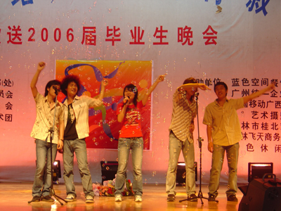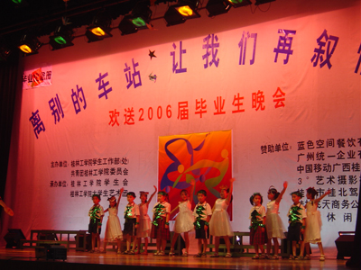 歌声远去,离别在即,虽然今天将近三个小时的晚会在漫长而难忘的大学四年面前显得那么的短暂,但是它又是那么的沉甸甸,携带着我们对2006届毕业生的无限祝福而永埋心间。心中的激情燃烧依旧,我们用一颗感恩的心将瞬间化做了永恒。让我们再次在心中默默祝福:亲爱的桂工毕业生们,愿你们在新的征途上扬帆起航,乘风破浪!