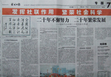 在庆祝桂林市社科联成立20周年之际,为总结经验,表彰先进,推动工作,日前,桂林市社会科学联合会颁发了《关于授予桂林市社会科学终身荣誉奖、桂林市社会科学工作特别贡献奖和桂林市社会科学研究贡献奖的决定》(市社科字[2005]23号),我院蔡雄老教授荣获“桂林市社会科学研究贡献奖”。