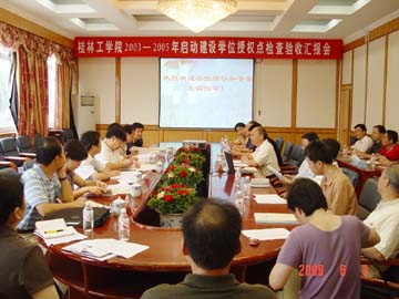 6月9日上午,自治区教育厅专家组到我院进行学位点学科建设验收和中期检查。在教八楼三楼会议室,学院党委书记阳国亮主持召开了“2003—2005年启动建设学位授权点检查验收汇报会”,专家组一行听取了学院副院长阮百尧作的2003—2005年启动建设的学位授权点中期自查、自评验收报告。 阮百尧副院长在报告总结中说,通过建设,我院2003---2005年三批启动的建设学位授权点在科研、学术、师资队伍、教学成果等方面取得了显著成绩,总体上按计划完成了建设的基本任务,主要指标都达到了任务书的要求:15个硕士授权点建设中有12个获得了硕士学位授予权。申报成功率达到80%。未获得授权的硕士和博士建设学科,也在科研、学术、师资队伍、教学成果等方面取得了显著成绩。
