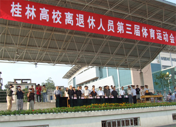 桂林高校离退休人员第三届体育运动会是由我院承办的一次传统老年人综合性体育盛会。 5月20日上午,桂林高校离退休老干部齐聚桂林工学院运动场,以简洁热烈的开幕式拉开了桂林高校离退休人员第三届运动会的序幕。区教育厅离退处卢祖生处长、覃长征副处长、桂林电子科技大学谭永红校长、桂林医学院党委副书记宿富国、桂林航专党委副书记旷永青、桂林师专副校长林铁城、广西师范大学离退总支书记甘卓勇,以及广西大学、广西民族大学、广西医科大学、广西师范学院、广西中医学院、广西艺术学院、广西教育学院的离退处负责人应邀参加了本次运动会开幕式。 入场式上,会旗、管乐方块、彩旗方块与来自6所桂林高校运动员代表队依次在雄壮的乐曲中进入运动场。我院离退处陈开亿处长主持了本次开幕式。 我院党委书记阳国亮代表学院作为承办方致欢迎辞,对出席本次运动会的领导与来宾表达了桂工诚挚的问候和欢迎,并指出:高校离退休人员是我们的宝贵财富,他们为党和人民的教育事业作出了突出贡献,离退休后应保持身心健康,坚持锻炼身体,快乐安度晚年。举办桂林高校离退休人员运动会,目的是激发、引导和带动广大离退休人员积极参加全民健身运动,陶冶情操,延年益寿,以达到老有所为、老有所乐的目的。并预祝各代表队在本届运动会上取得优异成绩!预祝桂林高校离退休人员第三届体育运动会取得圆满成功! 区教育厅卢祖生处长代表自治区教育厅致辞,对历届桂林高校离退休人员体育运动会活动的开展给予了极大的肯定,并对我院在承办本届运动会中为运动员、嘉宾提供的周到服务,为各项比赛创造良好条件以及所作大量工作给予了极大的肯定。 裁判员代表、运动员代表宣誓后,开幕式胜利结束。来自桂林广西师范大学、桂林工学院、电子科技大学、桂林医学院、航专、旅专、师专等6所高校的367名运动员即将在为期两天的运动会上参加包括门球、篮球、乒乓球等十个趣味体育项目的比赛,他们将在“友谊第一,比赛第二”的氛围中赛出风格、赛出水平、赛出成绩。桂林高校离退休人员运动会每两年举办一届,作为运动会的承办方,我院早作准备,周密部署,细致工作,不仅在本届运动会的运动项目选择上更注意结合老年人运动特点,同时全体工作人员也以“忠于职守、热情服务”的姿态保障着整个活动愉快、安全进行。