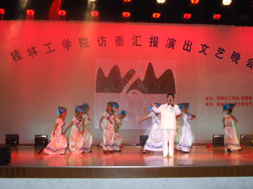 12月9日晚7:30,桂林工学院访泰汇报演出文艺晚会在体育馆三楼隆重举行。学院党委阳国亮书记、副院长周德俭、副院长阮百尧、桂林市出入境检验检疫局张正平局长、阳明祥主任,桂林市旅游局的李志刚局长、彭元力副局长等,桂林边防检查站的岑楚华政委、陈家安副站长以及我院各职能部门、各系(院)的领导来到了晚会现场。此外,晚会还邀请到了广西电视台、桂林电视台、桂林日报等媒体。