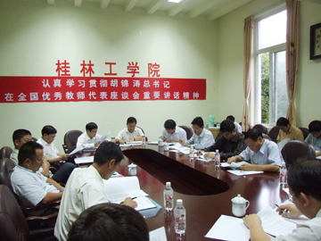 9月10日下午,学院召开会议,认真学习贯彻胡锦涛总书记在全国优秀教师代表座谈会重要讲话精神。党委书记黎志逘主持会议并作重要讲话。学院党委中心学习组全体成员及部分系院领导、教师代表参加了会议。 赵艳林院长在会上宣读了胡锦涛总书记《在全国优秀教师代表座谈会上的讲话》,并强调,胡锦涛总书记的讲话,充分体现了党中央、国务院对广大教师和教育工作者的亲切关怀和殷切期望,学习胡锦涛总书记的讲话,重在领会其精神实质,并贯彻到教学实际工作中去。教师要增强事业心和责任感,要刻苦钻研,不断探索,提高教书育人的能力;学校要大力推进教学改革,加强教学管理,为祖国培养出更多的、质量更高的合格人才,为我国社会主义经济建设作出更大的贡献。 黎志逘书记指出,胡锦涛总书记重要讲话,是对全国教育战线广大教师和教育工作者巨大的鼓舞和鞭策,充分体现了党中央大力实施科教兴国、人才强国战略的坚定决心,充分体现了党中央对教育事业的高度重视,充分体现了党中央对广大教师和教育工作者的亲切关怀和殷切期望。胡锦涛总书记的重要讲话,高屋建瓴,内涵深刻,意义深远,对于推进新时期教育改革和发展事业具有极其深远的意义。各单位、各部门要把学习贯彻胡锦涛总书记重要讲话精神作为首要任务,狠抓落实。他进一步强调,我们学习贯彻胡锦涛总书记重要讲话精神,一要以科学发展观统领学院教育事业发展全局,真正把教育教学工作摆在优先发展的地位;二要更加尊师重教,把教师队伍建设摆在更加突出的战略位置抓紧抓实;三要按照胡锦涛总书记提出的“三个必须”、“四点希望”的要求,努力造就德才兼备的高素质教师队伍;四要迅速行动,在全院掀起学习宣传和贯彻胡锦涛总书记重要讲话精神的高潮,各单位、各部门要安排时间,组织教师认真学习,开展讨论,撰写心得体会,交流学习经验,各级领导干部要带头学习、宣传贯彻落实胡锦涛总书记重要讲话精神。 与会教师代表纷纷发言,大家一致认为,胡锦涛总书记重要讲话,体现了党中央对教育事业的高度重视,对广大教师和教育工作者的亲切关怀,使广大教师深受鼓舞。并表示,一定要将胡锦涛总书记的讲话精神落实到教育教学工作中去,立德树人,为更好地推进学院教育事业大发展贡献力量。