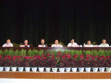 在主席台就座的领导(左起:华桂林、阮百尧、赵君、黎志逘、赵艳林、李祥清、肖明贵)