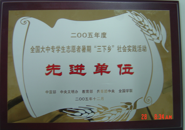 在26日结束的2006年广西共青团学校工作会议上,鉴于我校在2005年全国大中专学生志愿者暑期“三下乡”社会实践活动中实际工作表现和取得的突出成绩,中央宣传部、中央文明办、教育部、共青团中央、全国学联联合授予我院05年全国大中专学生志愿者暑期“三下乡”社会实践活动先进单位荣誉称号,这一殊荣的获得是对院校大学生暑期社会实践工作的充分肯定,也是对社会实践组织工作的表彰,也与学校领导的高度重视密不可分,同时,也是学校各级团组织和学生社团扎实开展工作和不断创新工作途径的有利体现。全区有九所高校获此殊荣,院团委书记江云清老师代表学校领取了该奖项。