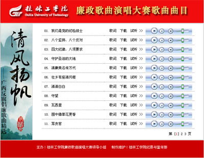 按照桂工党〔2006〕1号文件——《关于举办廉政歌曲演唱大赛的通知》的要求,落实学院廉政歌曲演唱大赛领导小组的工作部署,纪委与宣传部制作了“廉政歌曲演唱大赛歌曲曲目”网页,将《清风扬帆——广西反腐倡廉歌曲精选》上的33首歌曲进行了格式转换,对歌词进行了录入,并将歌曲和歌词制作在网页上,供全院师生员工在线播放、选曲、下载和演唱学习。