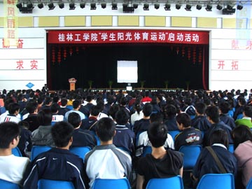 为了贯彻落实中央政治局会议精神,响应教育部、国家体育总局、共青团中央的号召,进一步加强青少年体育工作,在学院迅速掀起“学生阳光体育运动”热潮,按照自治区教育厅《关于全面启动广西学生阳光体育运动的补充通知》(桂教体卫艺〔2007〕43号)的要求,4月29日上午10时,学院与全国同步举行了“学生阳光体育运动”启动仪式。学院组织全院学生分四个会场收听或收看中央人民广播电台、中国教育电视台现场直播的北京现场启动仪式。学院党委书记黎志逘,院长赵艳林,副院长肖明贵,党委委员、人事处处长华桂林,党办、院办主任耿俊茂,党委宣传部、统战部部长于海平,学生工作部部长熊英,体育教学部主任冯玉斌在体育馆三楼礼堂的主会场参加了启动仪式。学院党委委员、组织部部长赵君主持仪式。 赵艳林院长在启动仪式上代表学院党委、行政对学生阳光体育运动的正式启动表示热烈的祝贺!赵院长在讲话中向全体学生阐述了开展阳光体育运动的意义,他号召学生走向操场、走进大自然、走到阳光下,积极投身到阳光体育运动中去。他指出,在高校中开展学生阳光体育运动,是新时期加强大学生体育活动、增强大学生体质的重要战略举措,对促进大学生的身体健康以及学习效率的提高和品格的形成,都将起到积极的促进作用。他希望广大学生积极响应教育部、国家体育总局、共青团中央的号召,按照学院的统一安排,坚持遵循教育性、科学性、趣味性、全面性的原则,坚持自主自愿与积极引导相结合的原则,坚持体育课与课外体育活动相结合的原则,走向操场、走进大自然、走到阳光下,积极投身到阳光体育运动中去,不断加强体育锻炼,积极磨炼意志,在学院掀起体育锻炼的热潮,在运动中展示蓬勃的朝气,在运动中培养体育锻炼的良好习惯,在运动中练就健壮的体魄和坚强的品格,成长为全面发展的优秀大学生,以实际行动迎接2008年北京奥运会的到来,以健康的体质、健壮的体魄、坚强的品格为党和国家的建设事业作出更大的贡献。 学院党委书记黎志逘用宏亮的声音宣布:桂林工学院“学生阳光体育运动”全面启动!随后,雄壮有力的运动员进行曲响彻校园,四个会场的近万名学生汇集到体育馆前,他们以系(院)为单位,举着系牌和系旗,沿着校园道路,集体慢跑一个小时。尽管下着小雨,但同学们以高涨的热情和饱满的精神风貌投入到这一活动。在我院体育场馆里,学院还组织开展了篮球、排球、羽毛球等球类健身活动。 学生普遍反映,国家如此大规模地开展阳光体育运动充分说明,社会对我们的要求不仅是掌握知识,还要求我们有健康的体魄。通过参加阳光体育运动可以培养我们具有良好的体质和坚强的品格,进一步增强我们的锻炼意识和团队意识,从而促进我们身心的健康成长,这对构建和谐校园具有非常重要的意义。 活动中,学院领导对我院今后进一步开展“学生阳光体育运动”工作作了重要部署。同时,还对所有的体育活动场馆(所)及体育设施进行了视察,并要求体育教学与相关管理部门认真做好日常管理和维护工作,使其随时保持着良好的可运行状态,以满足和保证学院“学生阳光体育运动”的顺利开展。 桂林电视台、桂林日报等媒体记者对我院本次活动进行了采访。