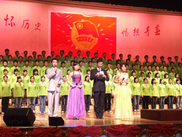 四位主持人宣布晚会开始 晚会在大合唱中拉开序幕