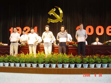6月30日下午,学院在体育馆三楼隆重召开庆祝中国共产党成立85周年暨表彰大会。学院全体共产党员,民主党派代表、无党派代表参加了庆祝大会,学院党委书记阳国亮,党委副书记、院长赵艳林,党委副书记、纪委书记唐善茂,党委副书记张学洪,副院长周德俭、阮百尧、肖明贵,党委委员赵君、解庆林出席了大会并在主席台就座。大会由学院党委副书记、纪委书记唐善茂主持。 在庄严雄壮的《国际歌》乐曲声中,与会人员全体起立,庆祝大会正式开始。学院党委副书记、院长赵艳林在大会上宣读了自治区高校工委关于表彰先进基层党组织、优秀共产党员、优秀党务工作者的决定和学院关于表彰先进基层党组织、优秀共产党员、优秀党务工作者的决定。我院机关党总支第5支部、资环系党总支、材化系党总支、旅游学院党总支学生第2支部荣获全区高校先进基层党组织,王德安、李景文、张发爱等10名共产党员荣获全区高校优秀党员荣誉称号,石柱鑫、江云清、莫坷、耿俊茂、胡祖生5人荣获广西高校优秀党务工作者荣誉称号。获得学院先进基层党组织的总支或支部共12个,优秀党员97名,优秀党务工作者7名。大会为以上获奖先进集体和个人举行了颁奖仪式,还为在6月29日晚廉政歌曲大赛中的获奖单位举行了颁奖仪式。 先进基层党组织代表材化系党总支书记胡祖生、优秀共产党员教师代表李景文、优秀共产党员学生代表朱宗强、优秀党务工作者代表黄中康先后在大会上发言。他们表示,今后要再接再厉,加强学习,努力工作,充分发挥共产党员的先锋模范作用,充分发挥基层党组织的核心作用和战斗堡垒作用,为学院“两申”目标的实现作出新的更大的贡献。 在大会上还举行了预备党员入党宣誓仪式。由学院党委组织部副部长伍飞军领誓,学院预备党员在党旗下进行了庄严的宣誓。 学院党委书记阳国亮发表了讲话。阳书记首先代表学院党委向学院全体共产党员致以节日的问候,向获得自治区高校工委和学院党委表彰的先进基层党组织、优秀共产党员和优秀党务工作者表示热烈的祝贺,向在党旗下庄严宣誓的新党员们表示热烈的祝贺,并希望他(她)们恪守入党誓言,为共产主义事业奋斗终身。在巩固保持共产党员先进性教育活动成果、雁山新校区建设已经启动、“两申”工作正在深入推进,50周年校庆庆典即将到来,我院改革与发展的任务极其艰巨而繁重的当前形势下,阳书记向学院广大共产党员提出三点希望:一是要继续发扬和巩固先进性教育活动的成果,建立先进性教育活动的长效机制;二是要切实加强各级领导班子建设,更好地发挥各级领导班子的领导核心作用;三是要充分发挥党组织的政治核心、战斗堡垒作用和党员的先锋模范作用。最后阳书记号召学院全体共产党员,要更加紧密地团结在以胡锦涛同志为总书记的党中央周围,高举邓小平理论伟大旗帜,认真实践“三个代表”重要思想,全面贯彻党的教育方针,按照学院党委、行政的有关部署,进一步弘扬桂工精神,同心同德,艰苦奋斗,励精图治,开拓创新,为创造桂林工学院美好明天而努力奋斗,为桂林工学院的蓬勃发展作出新的更大的贡献!