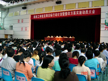 2005年11月10日下午,学院发展目标行动计划暨整改方案实施动员大会在体育馆三楼召开。学院党委书记阳国亮,院长赵艳林,副书记唐善茂、张学洪,副院长阮百尧等领导,自治区高校工委保持共产党员先进性教育活动督导三组组长李善辉参加了这次会议。大会由院长赵艳林主持,阳书记作了动员报告。阳书记的报告讲了以下三个主要内容:(一)实现学院发展目标行动计划的重要性;(二)全面了解行动计划的基本精神和主要内容;(三)实现学院发展目标要达到的要求。阳书记的报告,对学院全面推进先进性教育活动的整改工作,实现第二次党代会确定的“12455”总体目标,进行了更扎实更深入的部署,对每个党员、每个党员干部和每个党组织,提出了更具体更严格的要求。