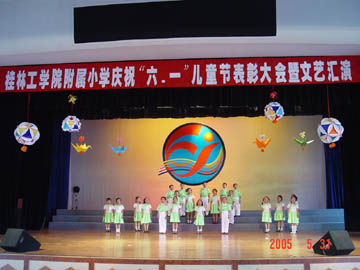 5月31日,附属小学在南校区礼堂举行庆祝“六一”儿童节表彰大会暨文艺汇演。 应邀前来参加活动的嘉宾有学院李祥清副院长、人事处陆娟娟副处长、民族基础教学部周荣华副主任、后勤集团蒋德岗副总经理、共青团桂林市委员会少年部吴晓罡部长、七星交警大队黎晓晖副大队长等13位领导。 李祥清副院长在大会上做了热情洋溢、激动人心的讲话。他首先代表学院领导向全体学生表示节日的祝贺,向工作在第一线的老师们表示亲切地慰问。接着他充分肯定了附小历年来为社会作出的较大贡献,培养出了后来就读于哈佛大学和清华、北大等国内外知名学府的许多优秀学生。他还勉励附小全体师生要与时俱进、开拓进取,充分利用好大学这一新的平台所提供的资源和优势,发扬和承继附小的优良传统,争取把附小办得更有特色、更有水平、更有知名度,办成桂林市、甚至全区小学的品牌。最后,他代表工学院给附小赠送了一台崭新的复印机,极大地激励了老师和同学们的工作和学习热情。 附小陆校长在会上表彰了一批一年来取得突出成绩的老师和学生,并鼓励大家再接再厉,刻苦拼搏,借助学院为附小提供的平台,把附小推上一个新的台阶。各位嘉宾为本学期获得桂林市优秀辅导员、优秀队员、优秀队干光荣称号的老师和学生颁发了奖状。 随后,举行文艺演出,同学们表演了歌舞、相声、双簧等丰富多彩的节目,整个会场掌声雷动,笑声不断,同学们在欢乐中庆祝自己的节日。