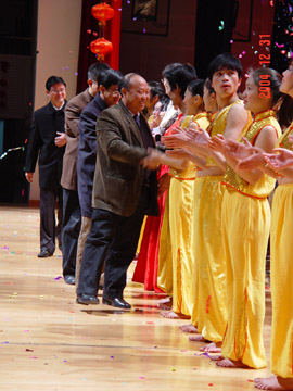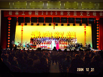 12月31日晚,学院体育馆三楼礼堂流光溢彩、彩球高挂、歌声嘹亮、舞姿飞扬、掌声阵阵、座无虚席,由学院党委宣传部、学工处、团委主办的2005年元旦文艺晚会在这里隆重举行,党委书记阳国亮、院长赵艳林、副书记张学洪、副院长阮百尧、离退休老干部和千余名师生观看了演出。 张学洪副书记在晚会开始前,代表学院致新年祝词,他回顾了我院2004年的总体工作,展望了学院的美好未来,并代表学院党委和行政向全体师生过去一年所取得的成绩表示热烈的祝贺,同时也向大家致以新年的衷心问候和祝福。 19:30,一曲雄壮豪迈的大合唱《祖国颂》拉开了晚会的帷幕,整台晚会形式多样,内容主题积极向上,融校园生活、地方风情、桂工特色和爱国主义于一体,将观众带入了祥和、欢乐的节日气氛中。 晚会在一曲优美的《难忘今宵》中结束后,学院领导走上舞台与与演员们亲切握手并合影留念。